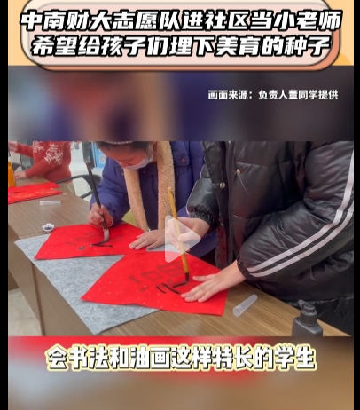 中南财大雪莲花志愿服务队“宋暖江岸”分队在武汉后湖跃进社区,对青少年们开展读国学、写春联、涂油画等教育帮扶活动。