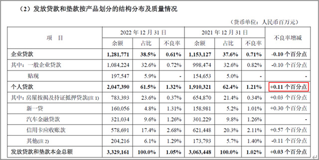 年报显示:2022年,平安银行个人贷款不良率为1.32%,为5年来新高,同比提升0.11个百分点。
