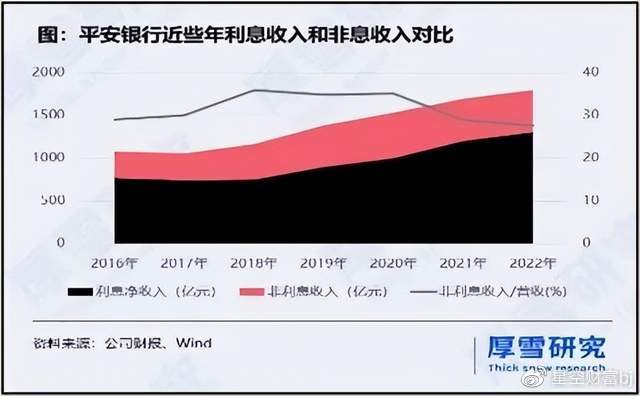首先,营收增长主要为利息净收入拉动,非息收入增速严重放缓。年报显示:2022年,虽然净息差收窄,但得益于贷款大幅增长。平安银行利息净收入同比增长约8.1%,成为拉动营收的关键力量。而市场更为看重的非息收入,仅同比增长1.5%,远低于以前年度。