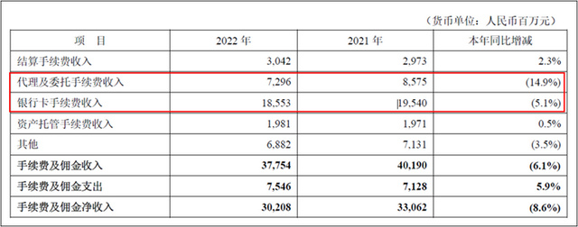 再看中间业务。受信用卡业务影响,占比最大的信用卡回佣(刷卡手续费)及收单手续收入大额减少,中间业务也是一言难尽。