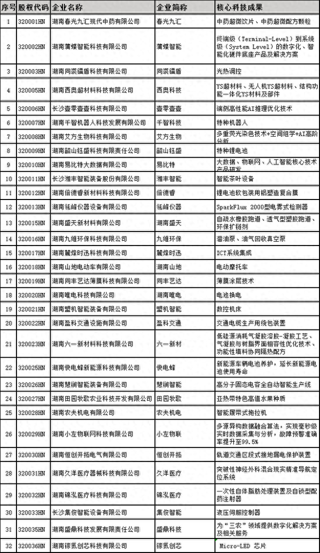 记者了解到,首批入板企业集中在战略性新兴产业,涉及新材料、生物医药、新一代信息技术、新能源与节能环保等领域,产学研紧密结合特征显著,核心技术或来源于自主研发,或与国防科技大学、中南大学、哈尔滨工业大学、湖南大学、湖南中医药大学、北京大学长沙计算与数字经济研究院等省内外知名高校或科研院所深度合作,其中12家入板企业的核心技术脱胎于省内外知名高校院所。