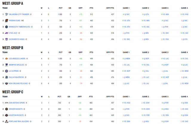 西部这边雷霆、湖人、马刺都是以小组第一身份晋级八强,只有太阳队是以小组第二战绩最好(净胜分最多)晋级八强,湖人、雷霆都是四连胜但因为雷霆净胜分+75更高所以雷霆是一号种子。