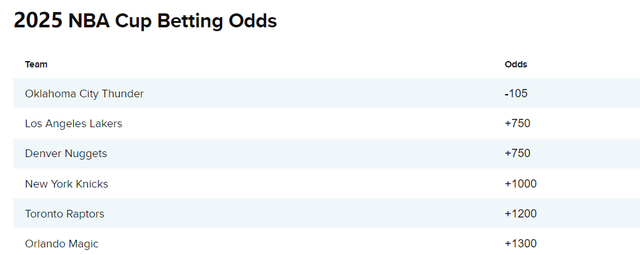 根据最新的杯赛夺冠赔率,雷霆-105断崖第一,湖人+750第二,掘金+750第三,尼克斯+1000第四,猛龙+1200第五,魔术+1300第六,雷霆这个领先的幅度还是无比之大。