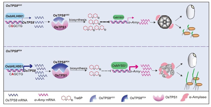 此次研究中,团队发现调控垩白的基因是OsTPS8。当它与OsTPS1互作时,TPS1的活性被抑制了,这降低了海藻糖-6-磷酸的生成,导致稻米发育的胚乳中α-淀粉酶活性增加,胚乳淀粉降解得多,于是垩白形成。