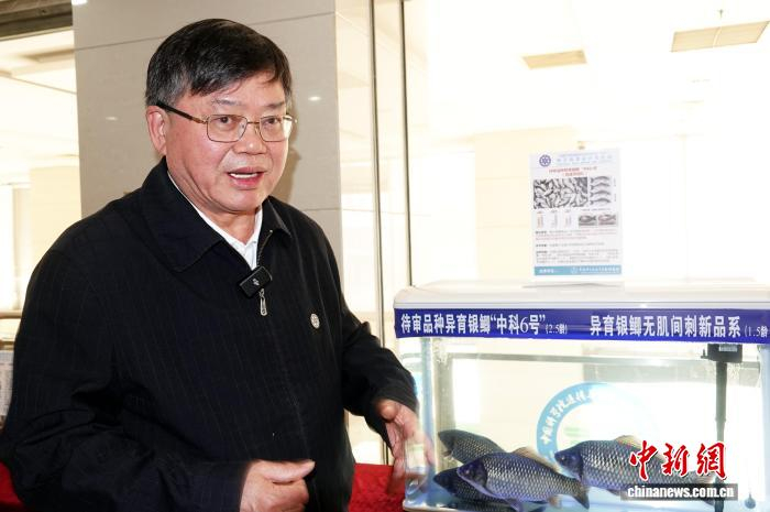 桂建芳院士介绍发布会会场外展示的鲫鱼新品种和新品系。中新网记者 孙自法 摄种子专项还引领水产设计育种。中国科学院院士、中国科学院水生生物研究所研究员桂建芳团队首次提出“双三倍体”概念,创建基于生殖方式转换的设计育种技术体系,培育出具有高产、抗病、节粮三大优势性状的异育银鲫“中科6号”候选新品种,其生长速度、养殖存活率、饲料效率比“中科3号”分别平均提升25.0%、66.5%、20.1%。该团队还结合基因编辑创建育性可控设计育种技术体系,创制出可用于养殖的无肌间刺异育银鲫。