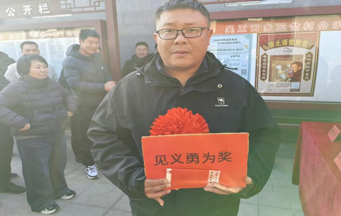 副县长穆子江向严寒中不顾个人安危跳入冰水中勇救两名落水儿童的村民强鹏飞颁发了见义勇为奖,希望父老乡亲以强鹏飞为榜样,让德者有得、好人好报,让正气之风蔚然成风。村民们由衷点赞,现场响起了经久不息的热烈掌声。